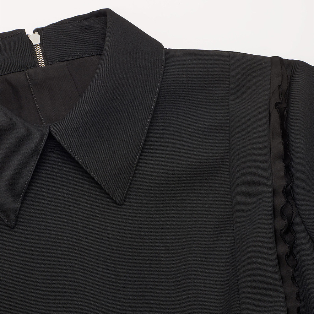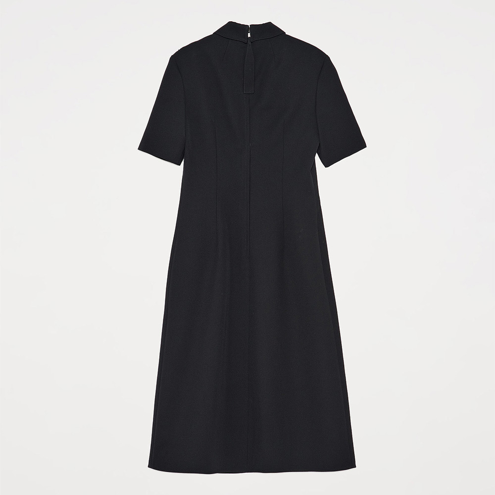 カーフレングスのショートスリーブドレス。カットアウトのフリルディテールが特徴。センターバックジップ開閉。