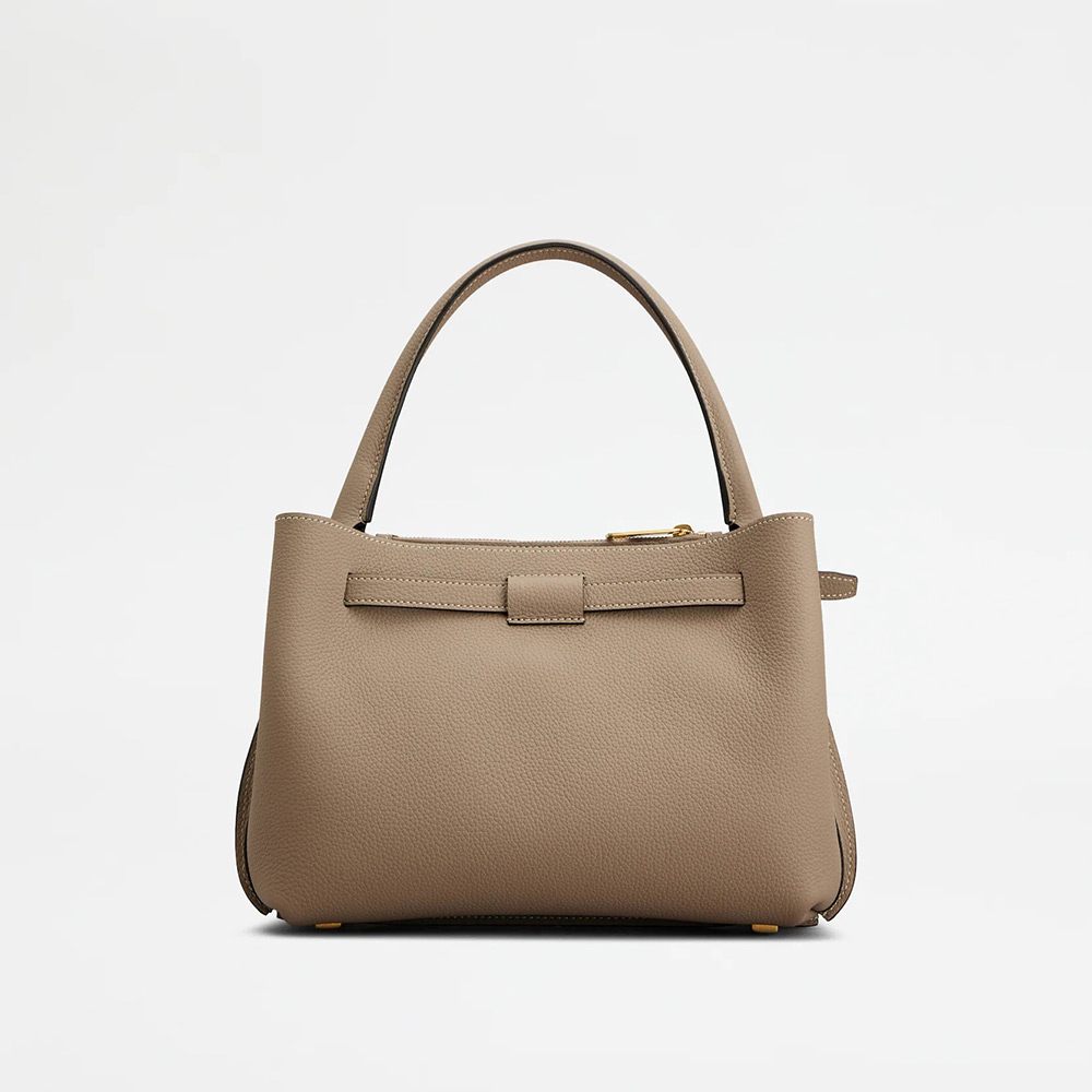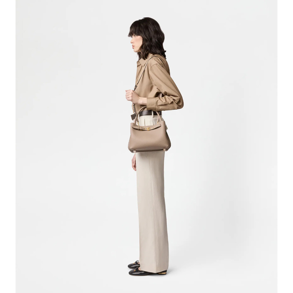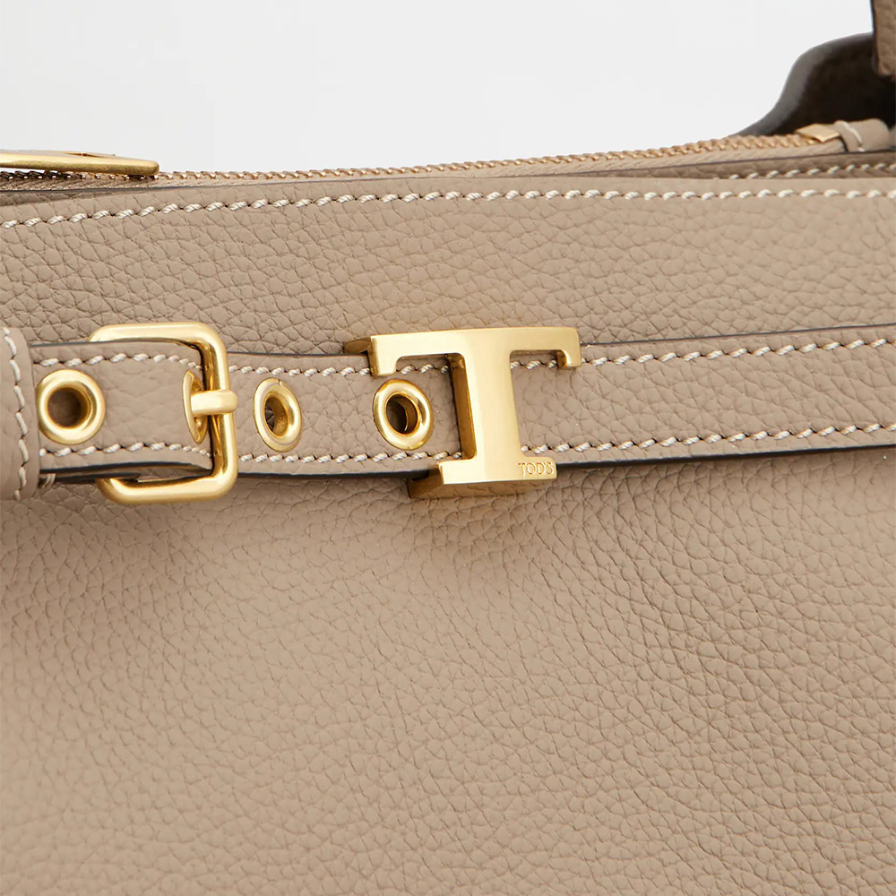 トップ エッジにベルトとアイコニックな T タイムレス アクセサリーをあしらった、柔らかなカーフ レザーのミニ バッグ。チューブ ハンドル、センター ポケットで仕切られた2つのコンパートメント、調節・取り外し可能なショルダー ストラップを合わせ、ディリー ルックにぴったりのスタイルです。