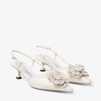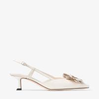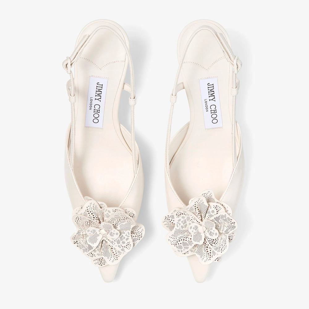 フォルムと装飾の絶妙なバランス。光沢のあるナッパレザーを使用したスリングバック、ミミ。パーフォレーテッド ジミー チュウ レースでつくられた彫刻のようなコサージュで格調を高めています。洗練されたストラップが足を美しく縁取り、フレアに広がるキトゥンヒールが優雅な高さを添えます。
