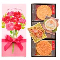カーネーションとメッセージを描いた母の日限定のお品と、初夏をテーマにしたえびせんべいを詰め合わせました。「お母さんいつもありがとう」心からの感謝の気持ちを伝えます。