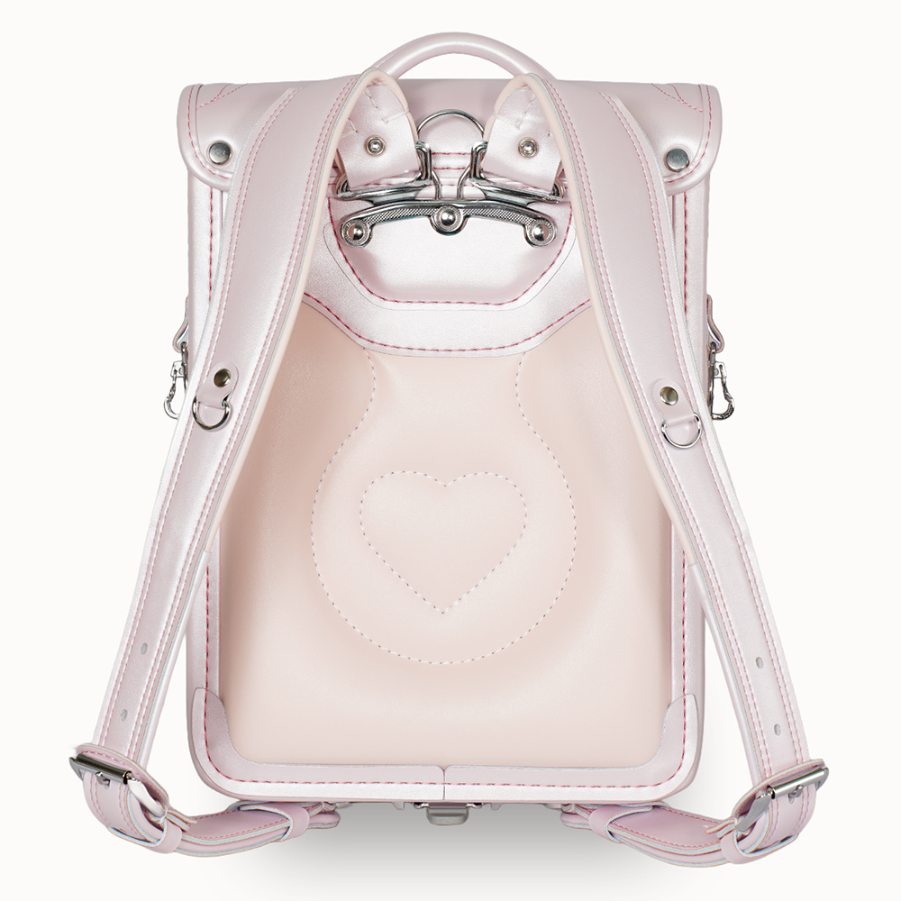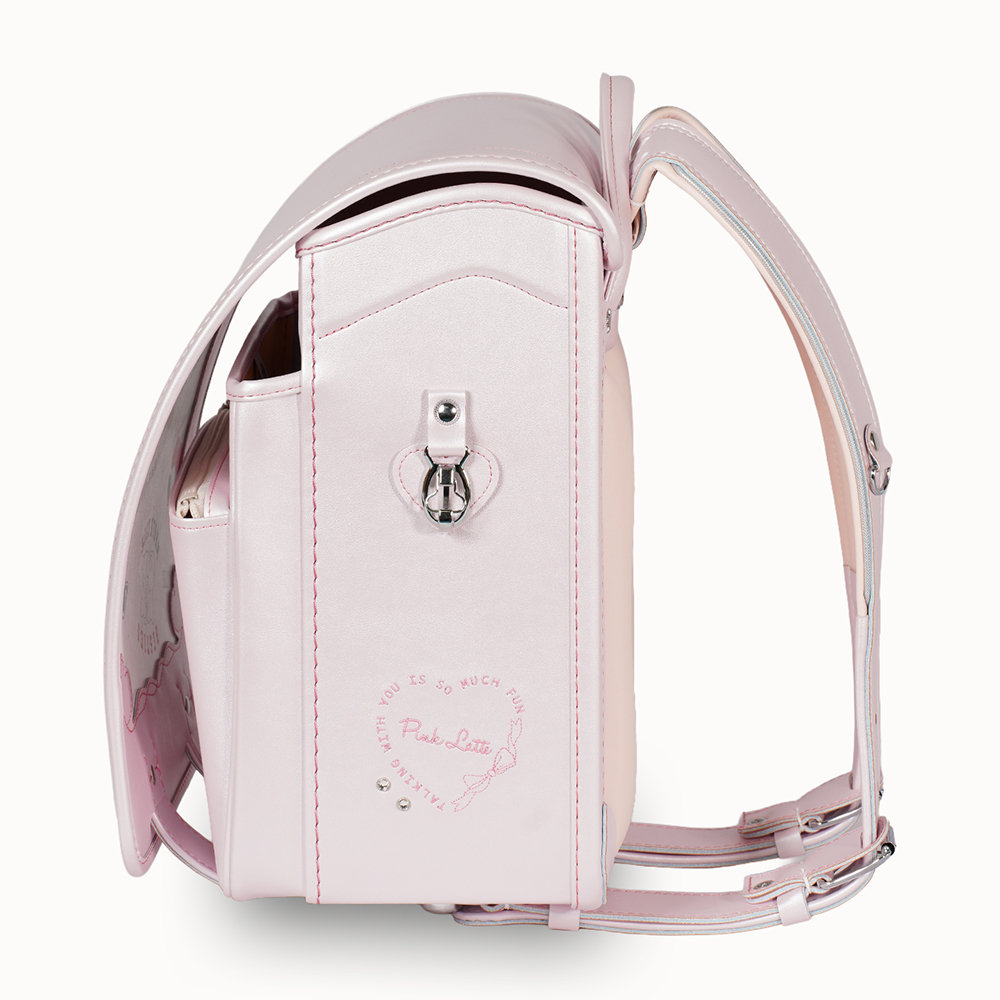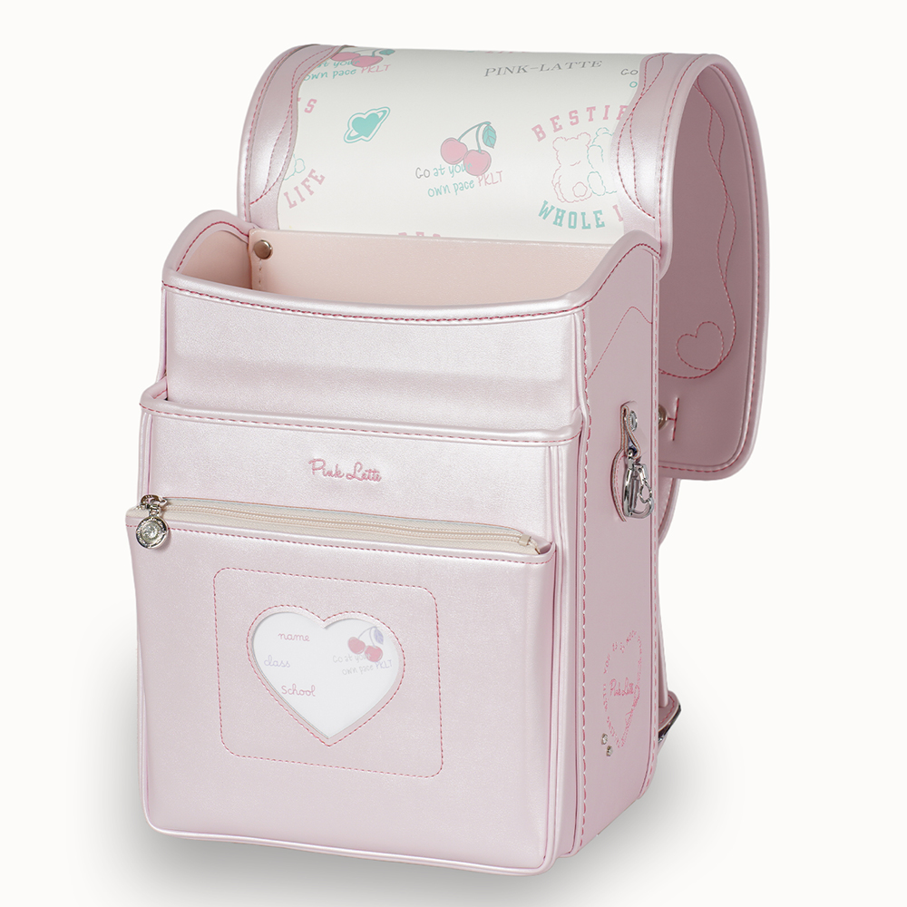 お子さまの「今欲しい」をかなえるピンクラテとのコラボランドセルが登場。ガーリーなデザインに、パールのような大人っぽいきらめきをまとったランドセル。