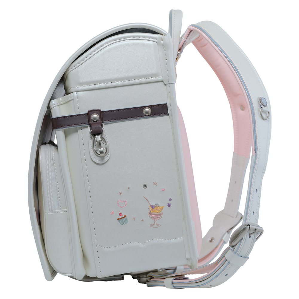 お気に入りのケーキみたいにとびきり可愛いランドセルで。ファスナーチャームもスイーツ柄がポイント。肩ベルトにはやわらかいクッションが入り、重たいランドセルも軽く感じさせます。