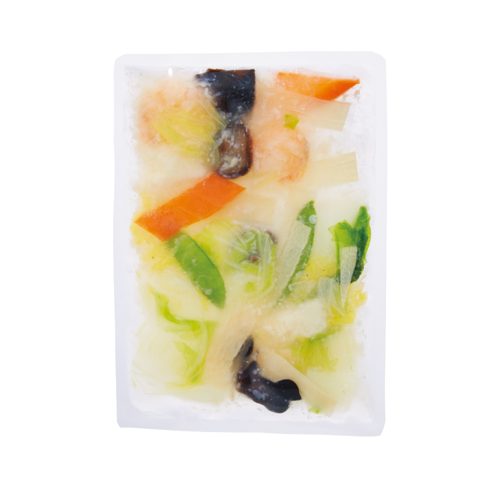 エビ、イカにしっかりと下味付けをして揚げ、6種類の野菜(白菜、にんじん、タケノコ、椎茸、きくらげ、きぬさや)とともに、塩味のマイルドで旨味のあるソースで仕上げました。