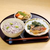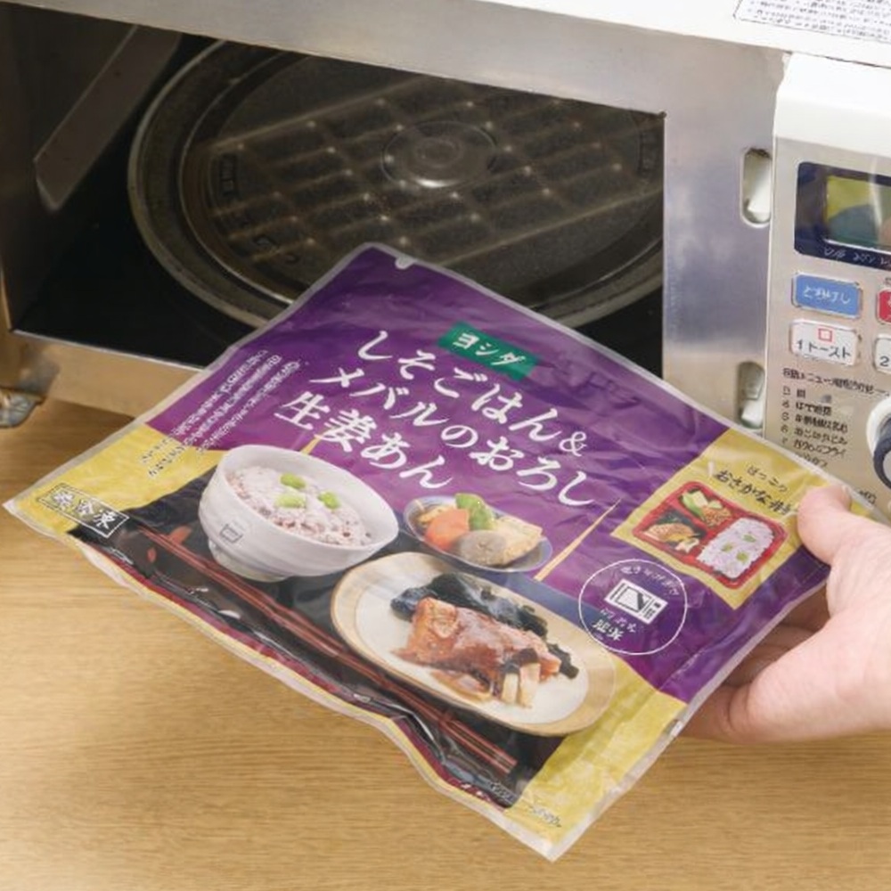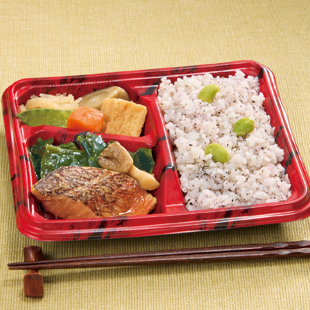 主食・主菜・副菜が1つにセットされた和風弁当です。電子レンジで温めるだけでお召し上がりいただけ、お皿も使用しないため便利です。しその香りが効いたゆかりごはん、メバル煮におろし生姜あん、副菜に5種の煮物とほうれん草と人参のお浸しをトッピングしました.