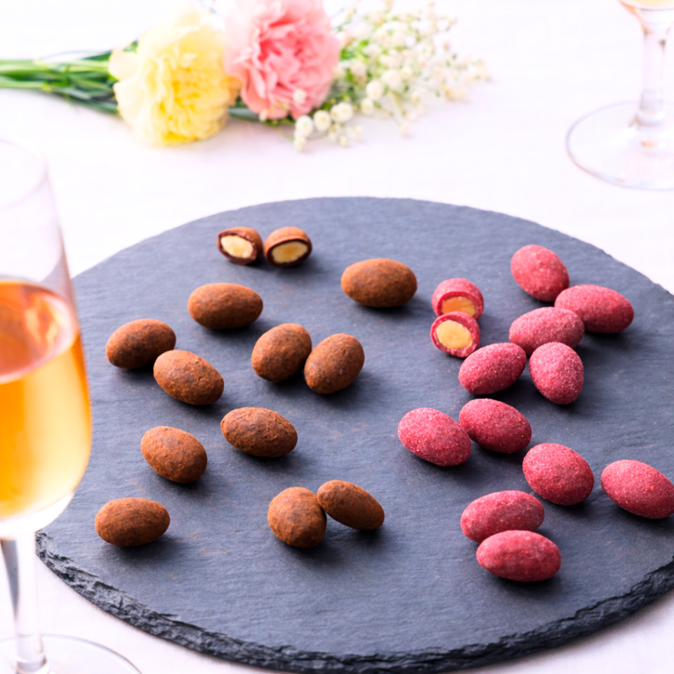 老舗和菓子企業で職人長を務めた代表が立ち上げた、アーモンドチョコレート専門店<MR&MRS BEAN>。「カカオ・アーモンド・和三盆糖」を中心に、動物性原料や食品添加物を一切使用せず、100%植物性の自然素材のみで仕上げたアーモンドチョコレートを手がけています。本商品は、ローズベリー、ショコラ、ラズベリー、抹茶の4種を詰め合わせたアーモンドチョコレートに、生花ブーケを添えた、母の日限定のギフトセットです。和三盆糖の上品ですっきりとした甘味、香ばしいアーモンド、上質なカカオが織りなす味わいは、珈琲や紅茶にはもちろん、ワインや日本酒などお酒と一緒にもお楽しみいただけます。