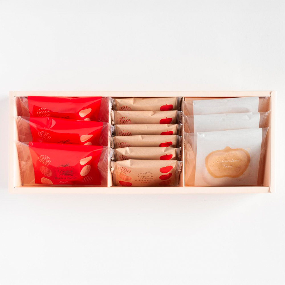 コロコロとりんごの形がかわいいバターの風味豊かなフィナンシェと、りんご風味のチョコレートを挟んだアップルバター風味のサンドクッキー、ホワイトチョコとりんごを使用したチョコレートを流し込んだチョコタルトのセットです。