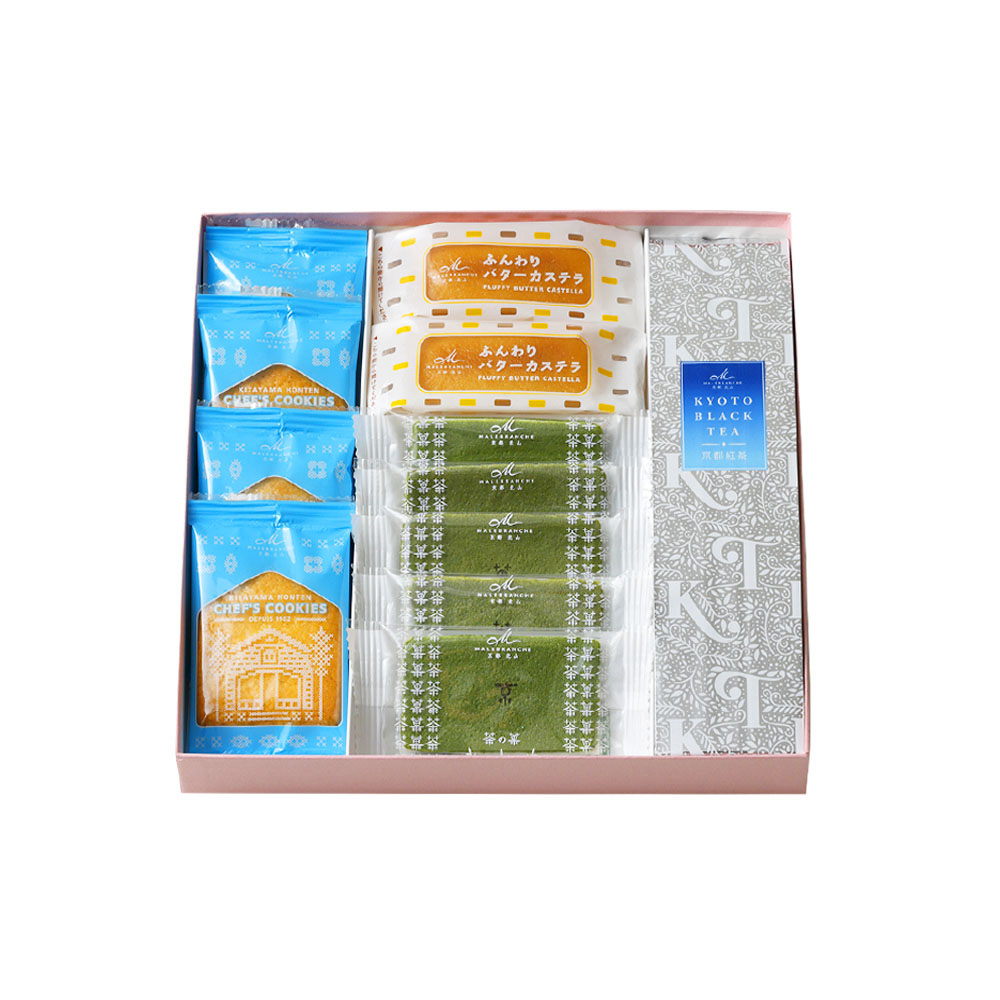 愛され続けるマールブランシュの顔、お濃茶ラングドシャ「茶の菓」を含む、詰め合わせをご用意しました。発酵バターの香り豊かな「ふんわりバターカステラ」、上質で豊かな香りのバターをたっぷり使った「北山本店シェフクッキー」に、ミルクの味わいやバターの香りとよく合う、お菓子とのペアリングを考えた京都紅茶が入った詰め合わせです。京都紅茶は、マールブランシュオリジナル。茶葉の栽培から発酵までこだわり、少量生産で丁寧にお作りしています。母の日限定パッケージで登場。