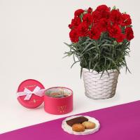 ヴィタメール人気の焼き菓子詰合せと、華やかに咲き誇る赤いカーネーションの花鉢を組合せ。「母の日」感謝の気持ちを込めた贈りものにおすすめです。