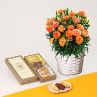 ヴィタメール人気の焼き菓子詰合せと、優しい雰囲気のオレンジ色のカーネーションの花鉢を組合せ。「母の日」に贈るおすすめの組合せギフトです。