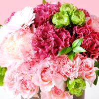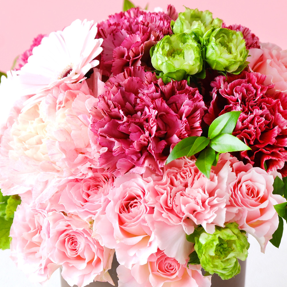 母の日のギフトにぴったりなカーネーションとバラのアレンジメント。可愛らしいガーベラがアクセントになっています。「ヴェリテ」とはフランス語で「真実、変わらない愛」を意味します。ピンク色のグラデーションが美しい、大人可愛いデザインです。