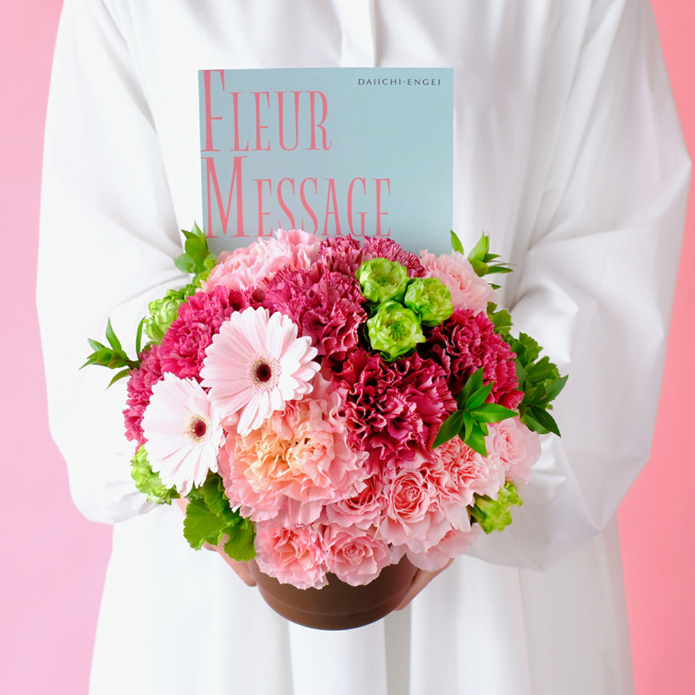 生花:カーネーション、スプレーバラ、ガーベラなど 花器:エコプラスチック