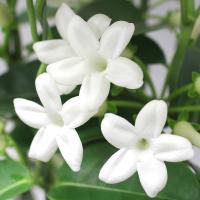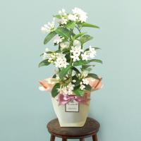 優雅で甘美な香りが特徴のジャスミン。純白の可愛らしい花を咲かせます。薫り高い純白の花は、ウエディングブーケにも利用されます。葉は艶のある美しい常緑なので、花の咲いていない時期でも観葉植物としてもお楽しみいただけます。