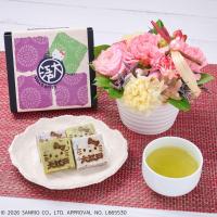 母の日の贈りものに。カーネーションを中心とした優しさ溢れるアレンジメントと<ハローキティ>きんつばのセットです。