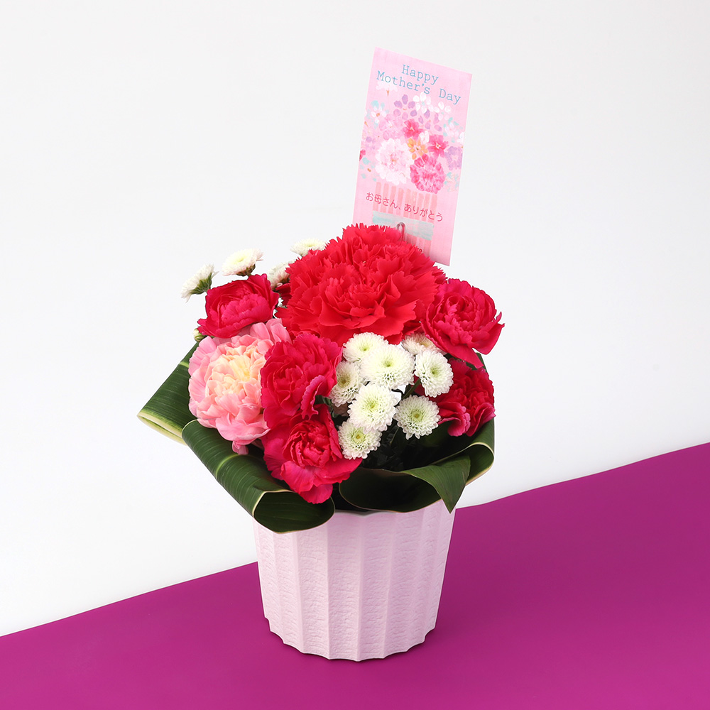 甘さすっきりと密漬けにしたさくらんぼをなめらかな口あたりのぜりぃで包んだ花桜桃と、ブルーベリーやイチゴ、白桃、りんごの果実ようかんを詰合せて、濃いピンクのカーネーションを中心に仕上げた華やかでエレガントな色合いのアレンジメントフラワーと組合せいたしました。「母の日」の贈りものにおすすめの組合せギフトです。※写真のアレンジメントフラワーは、三方見の仕上げとなっておりますので後ろにお花は入っておりません。「母の日」ギフトカードの向きが正面となりますので、壁などを背にして置いていただけるとより綺麗にお楽しみいただけます。アレンジメントフラワーは暑さに弱いため、直射日光を避け涼しいところに置いていただくことをおすすめいたします。