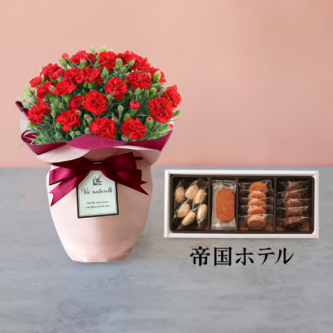 母の日の象徴ともいえる赤いカーネーションの鉢植えと<帝国ホテル>のクッキー詰合せのセット。育てやすい鉢植えは可愛らしいラッピングでよりいっそう喜ばれる1番人気のアイテムです。<帝国ホテル>で長きにわたり愛され続けるクッキー詰合せは、ドライフルーツやナッツなどの素材の風味をいかした個性的な味わい。心をこめて焼き上げた大人気のクッキーは、個包なのも嬉しいポイント。バターの風味と香ばしさを大切にサクッと焼き上げたフレンチタイプです。