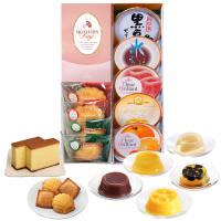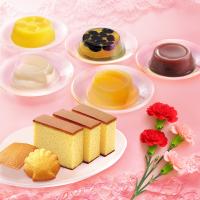 母の日カステラ(5切れ)×1個、焼菓子2種詰合せ(マドレーヌ×2、ココナッツフィナンシェ×2 計4個)×1個、デザート詰合せ(フルーツゼリーオレンジ×1、フルーツゼリー白桃×1、マンゴープリン×1、水ようかん×1、黒豆ゼリー×1)×1個
