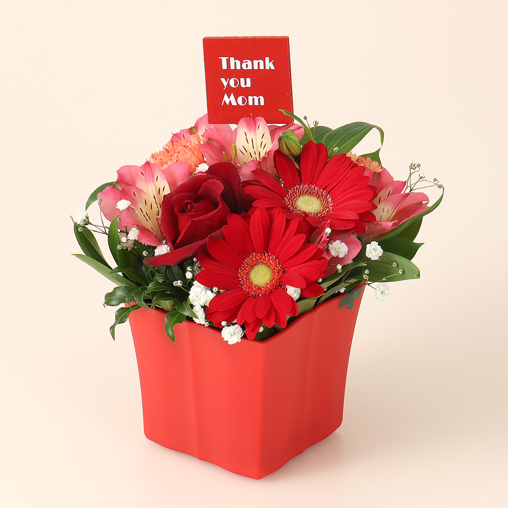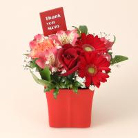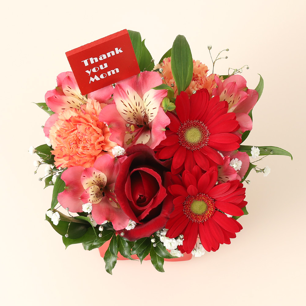 バラ、ガーベラ、カーネーションと蓼科高原のアルストロメリアを使ってアレンジいたしました。Thank you Momのピックで日頃の感謝の気持ちを表します。