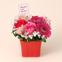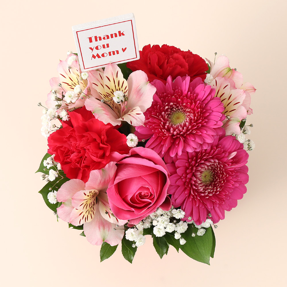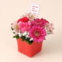 バラ、ガーベラ、カーネーションと蓼科高原のアルストロメリアを使ってアレンジいたしました。Thank you Momのピックで日頃の感謝の気持ちを表します。