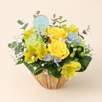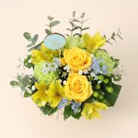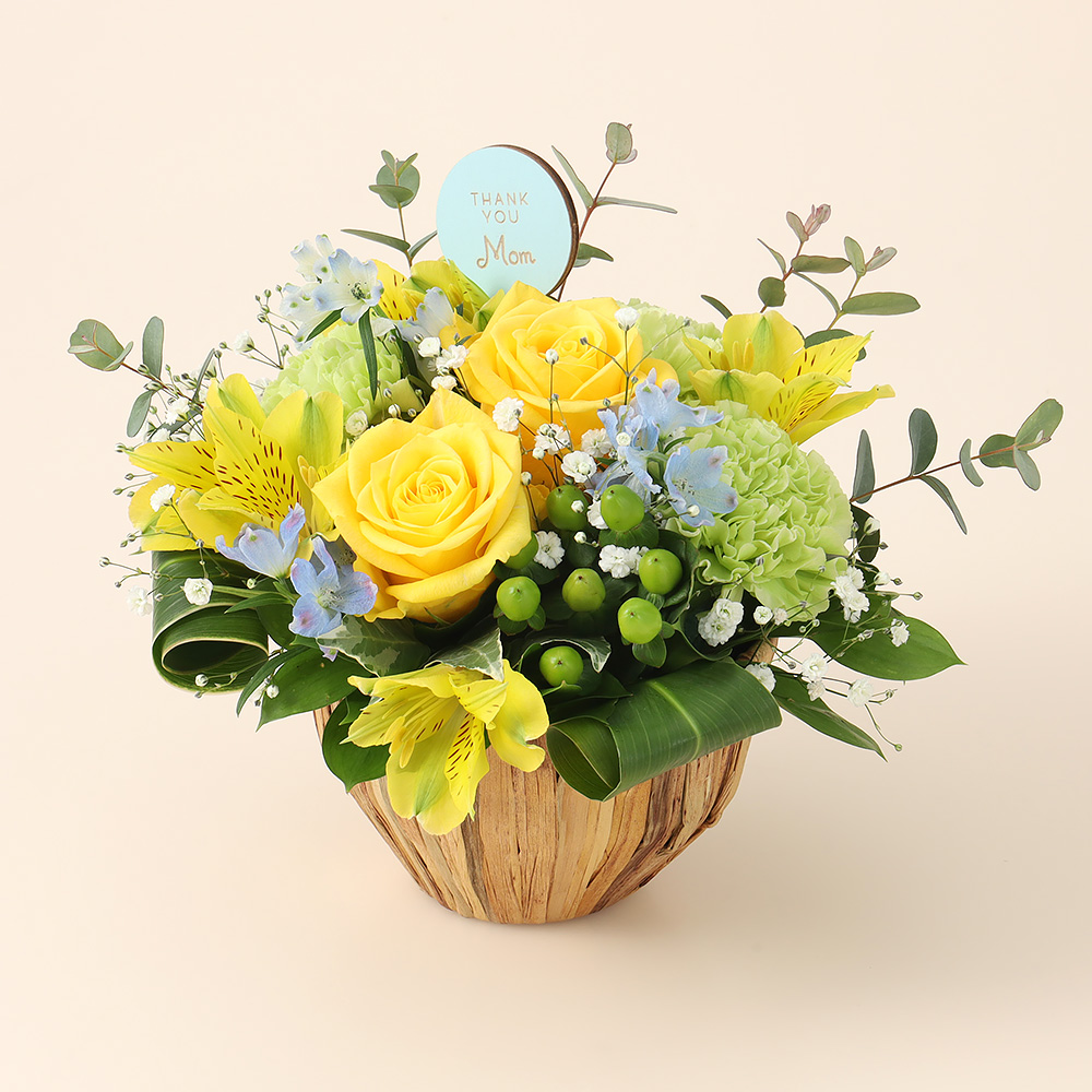 鮮やかなイエローのバラとカーネーションをメインに、お母様への感謝の気持ちを込めてお届けいたします