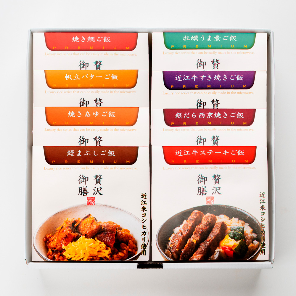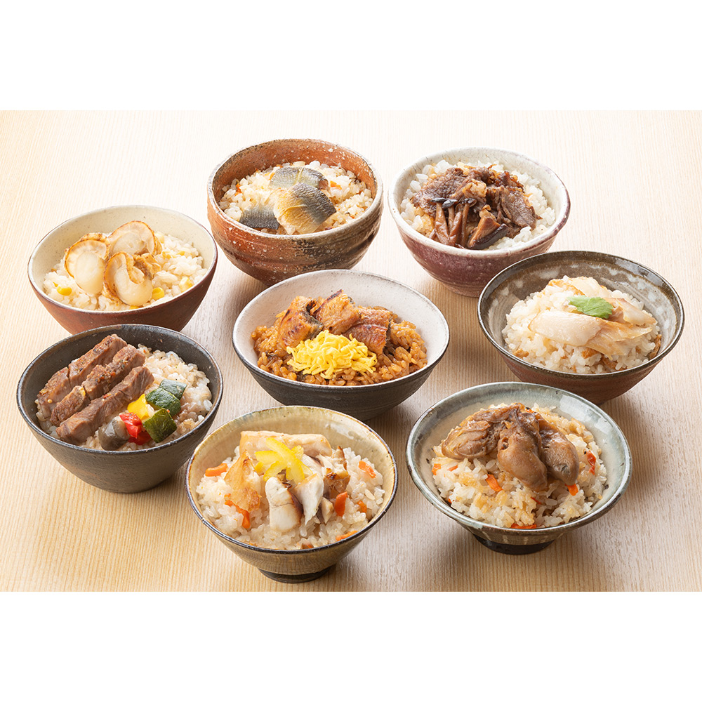 近江牛や鰻、鮎などの厳選食材と滋賀県産コシヒカリを使用し、老舗の技で丁寧に仕上げています。電子レンジで温めるだけ、手間いらず・食べきりサイズの本格的な一膳です。多彩な8種の味わいをお楽しみください。1:【近江牛ステーキご飯】近江牛サーロインステーキの贅沢なご飯。2:【近江牛すき焼きご飯】とろけるような近江牛のすき焼き。3:【鰻まぶしご飯】炭火焼きした国産鰻の香ばしい味わい。4:【銀だら西京焼きご飯】脂のりの良い、京都仕込みの銀だら西京焼き。5:【帆立バターご飯】帆立の甘みと旨味が際立つご褒美ご飯。6:【焼きあゆご飯】「香魚」鮎の風味を味わう涼やかな一膳。7:【焼き鯛ご飯】香ばしく焼いた鯛の上品な味わい。8:【牡蠣うま煮ご飯】凝縮した牡蠣の旨味を味わう一膳。