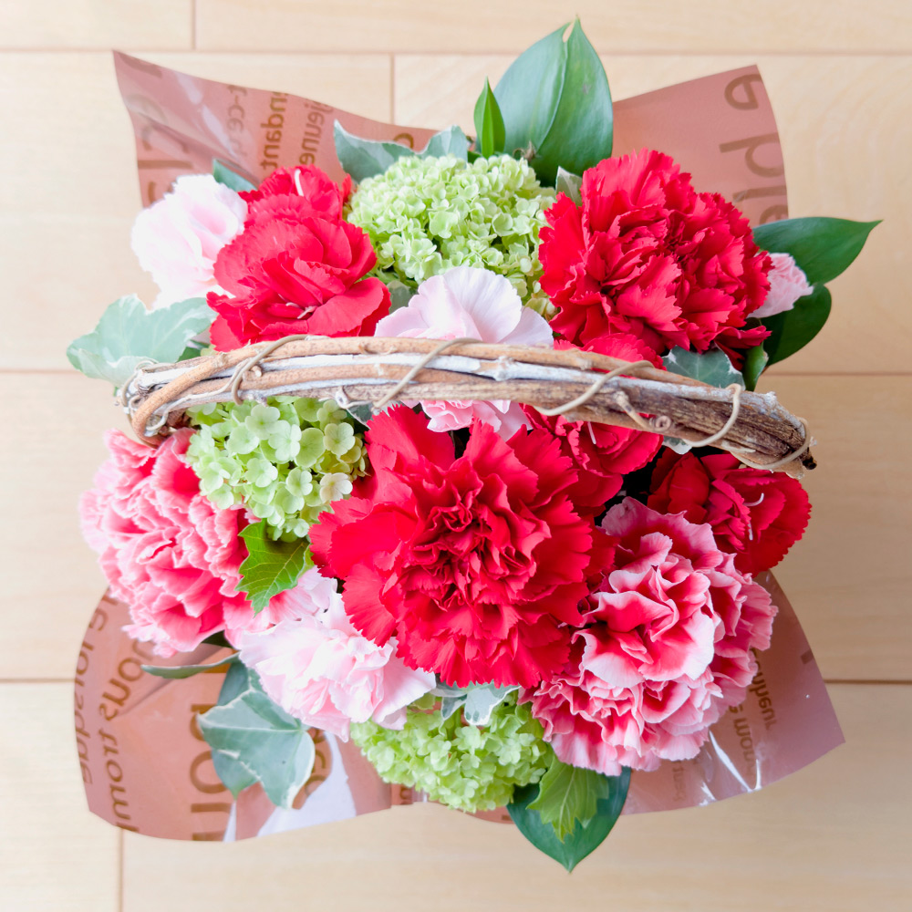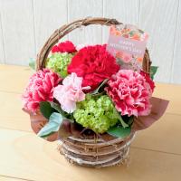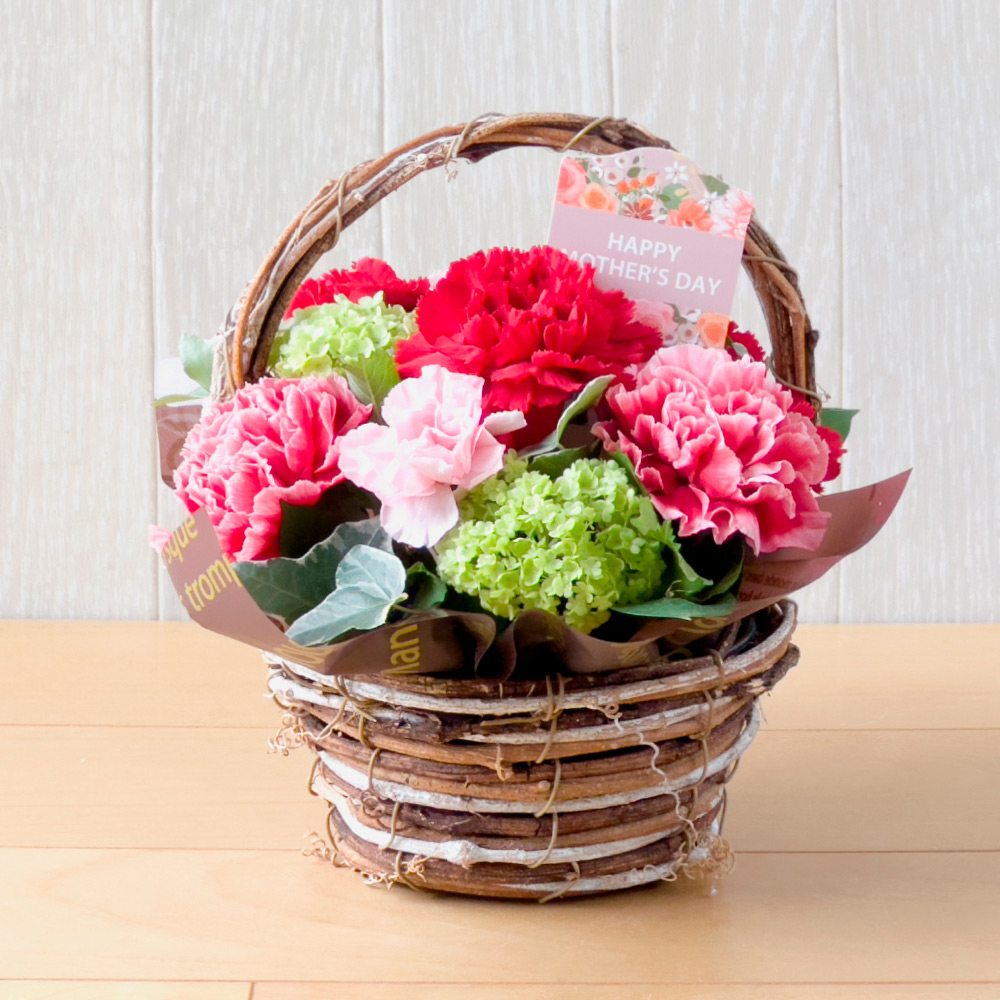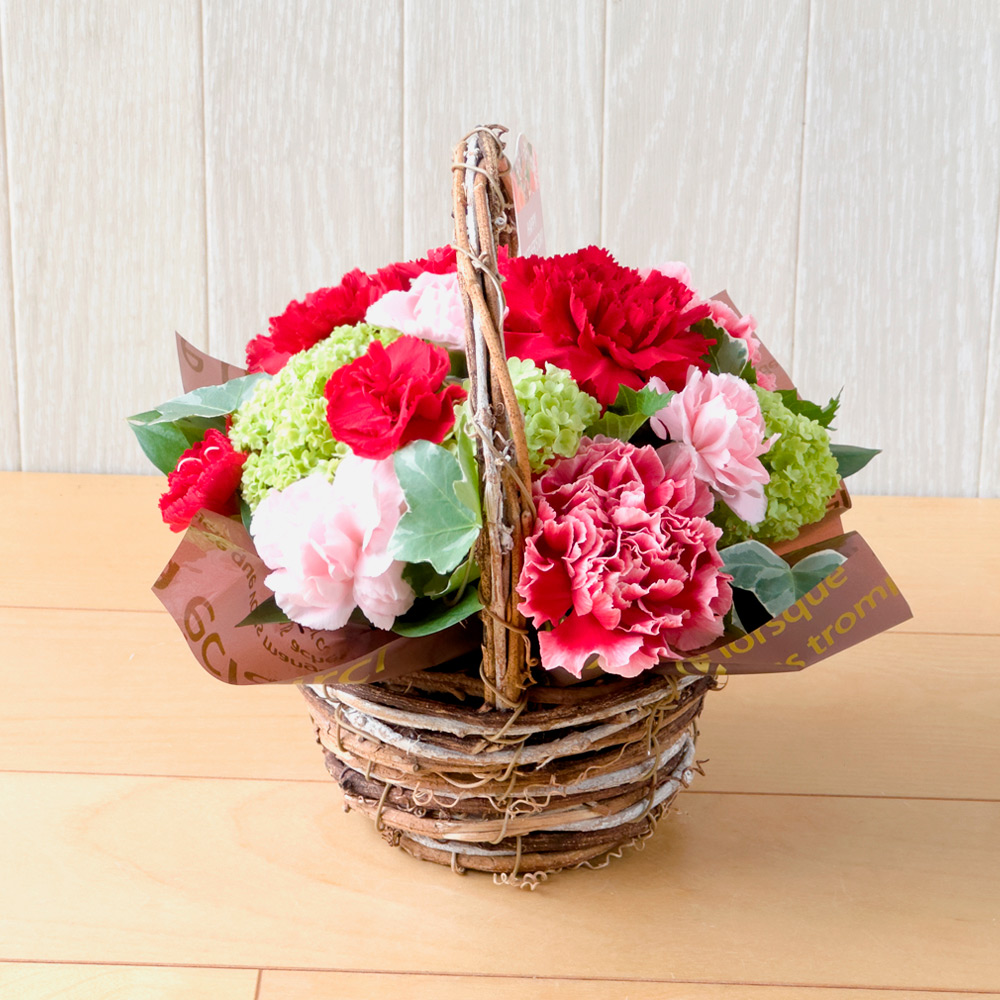 母の日には赤いカーネーションが人気です。大輪とスプレー咲きのカーネーションをナチュラルな印象の手つきバスケットにアレンジしました。