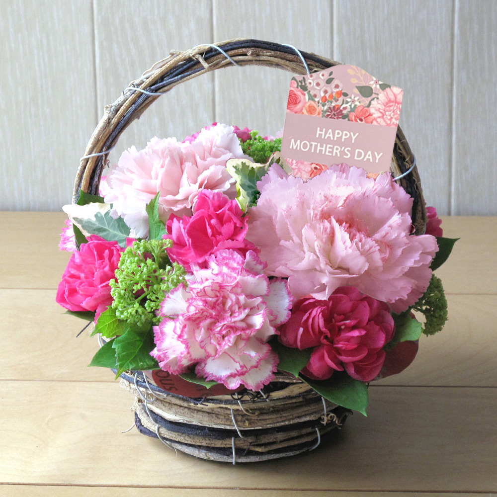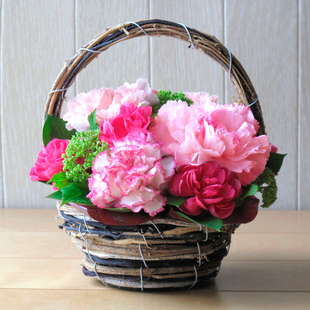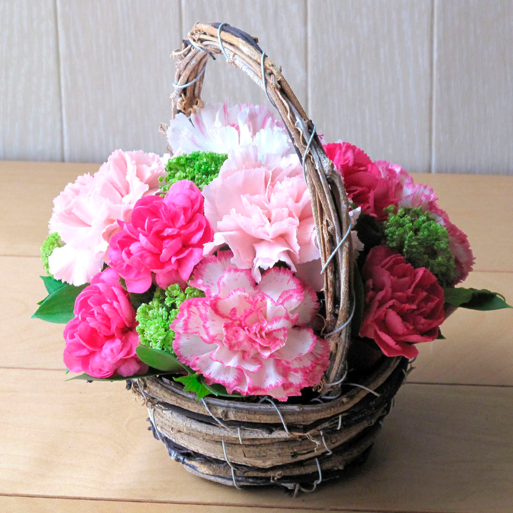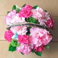 2色のピンクカーネーションがかわいらしいアレンジメントです。大輪とスプレー咲きのカーネーションをナチュラルな印象の手つきバスケットにアレンジしました。