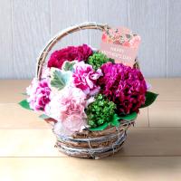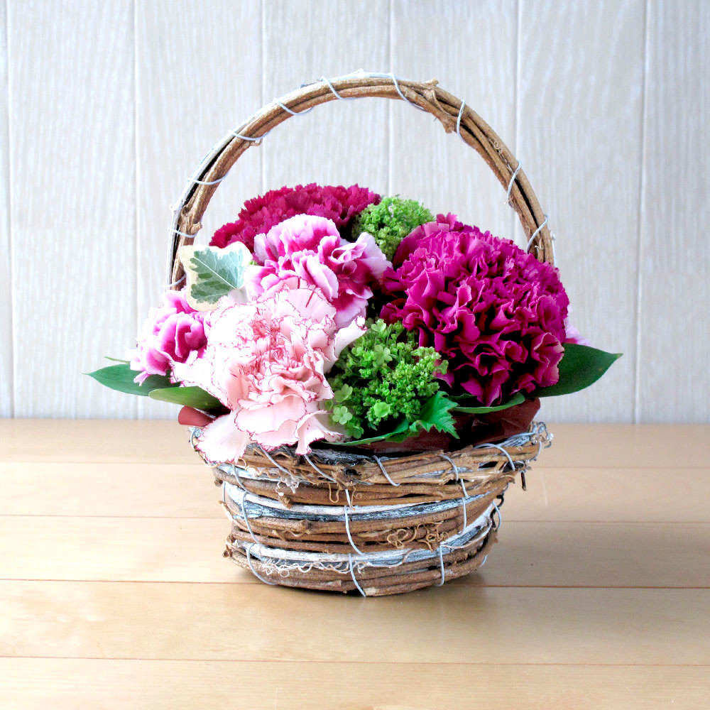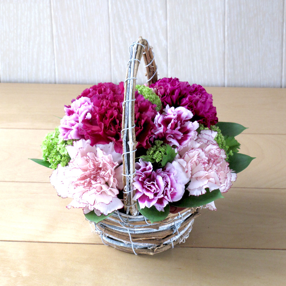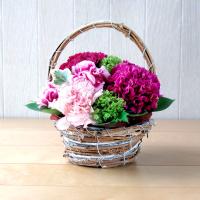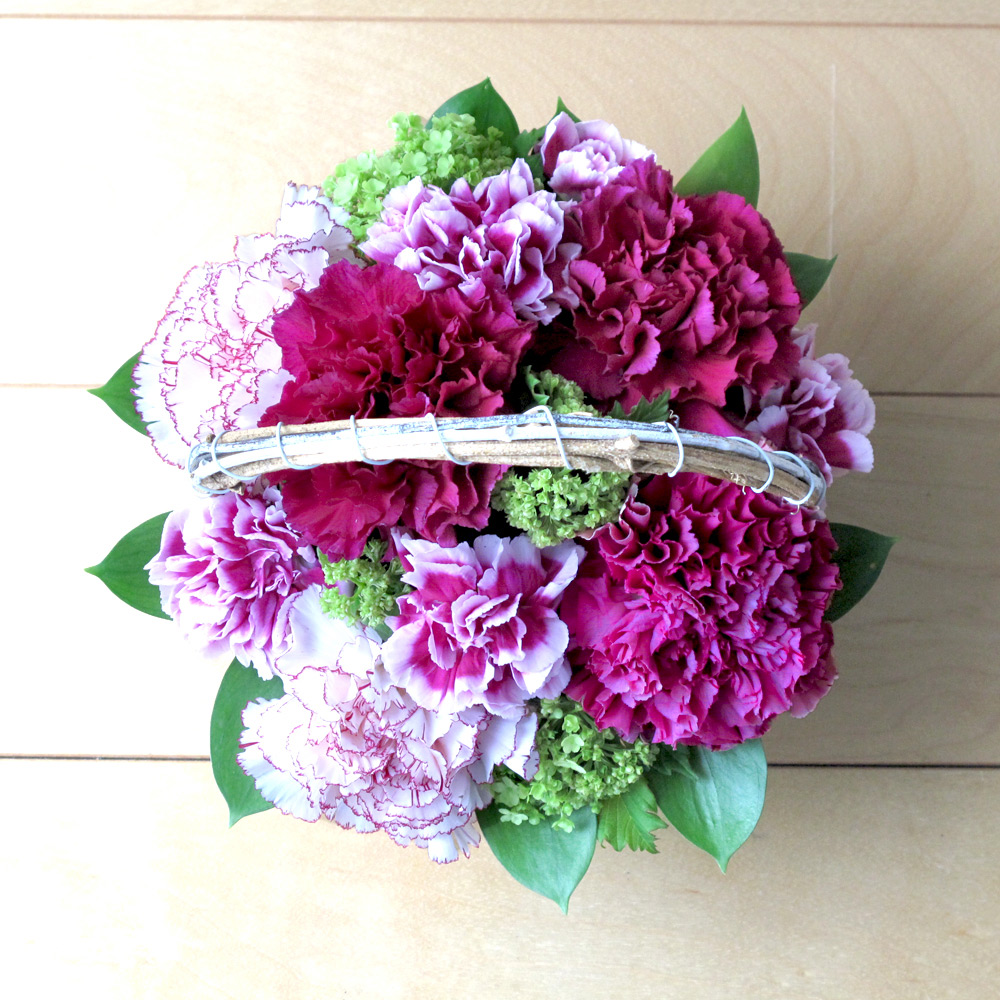 紫系のカーネーションをつかい、高級感漂う落ち着いた雰囲気のアレンジメントに仕上げました。飾りやすく、移動もしやすい手つきバスケットを使用しています。