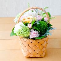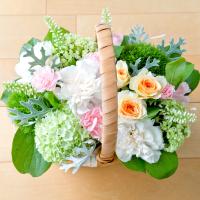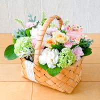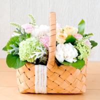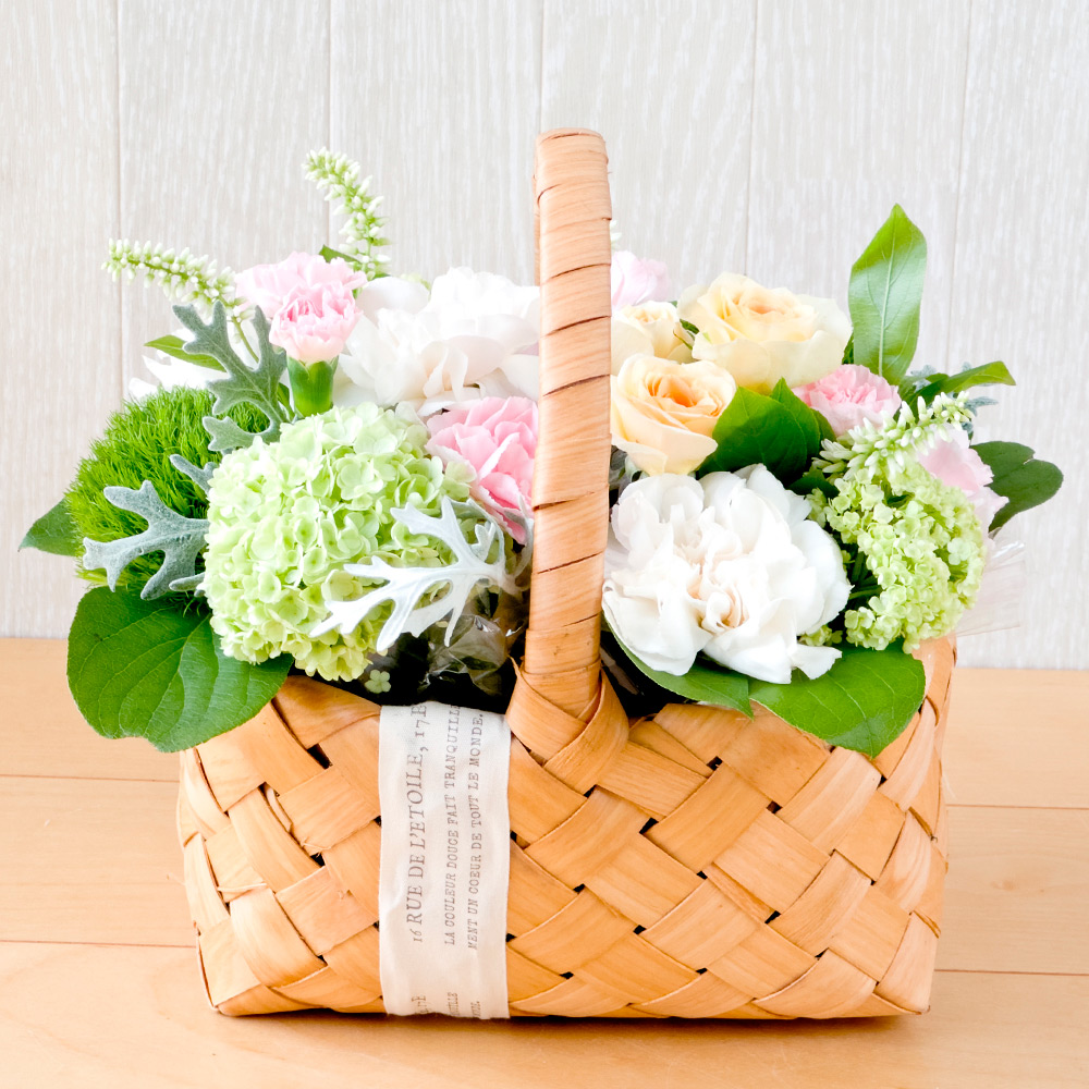 カーネーションはもちろん、スプレーバラや人気のテマリソウなどを使い、北欧風のバスケットにアレンジしました。グリーンと淡い色合いがナチュラルな雰囲気です。