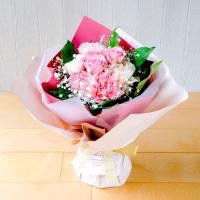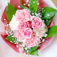 花材:バラ、カーネーション、かすみ草、、葉ものなど