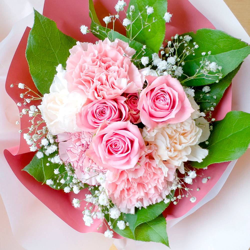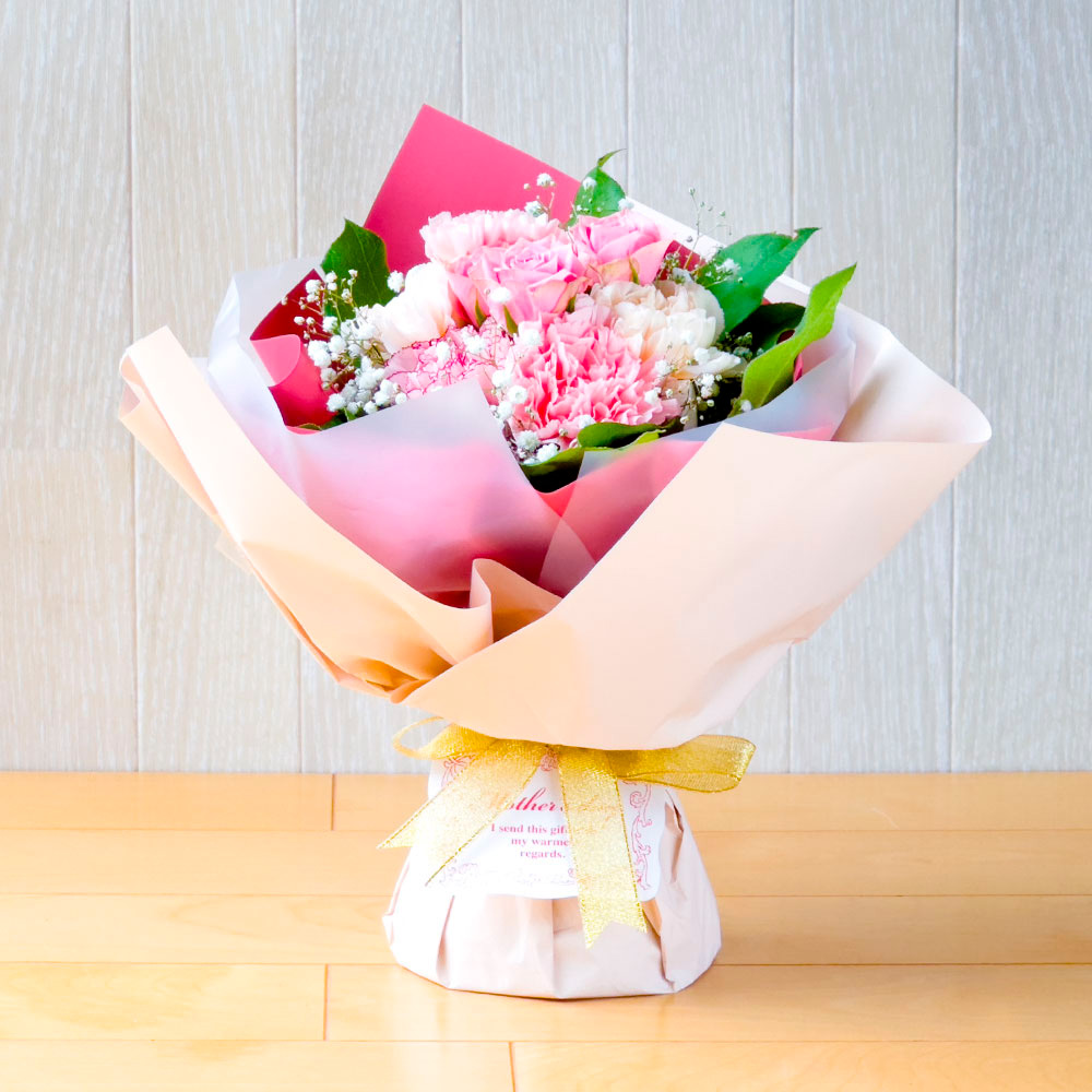 そのまま飾れるバラとカーネーションとカスミ草のスタンディングブーケピンク系ミックス
