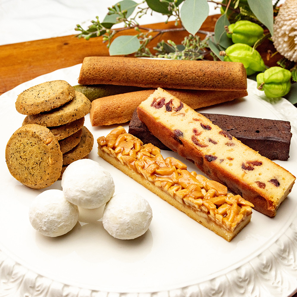 クッキー(アーモンドボール、紅茶)各1袋、バトン(プレーン、メイプルシロップと黒糖、アールグレイ、抹茶と黒豆)、パウンドバトン(クランベリー、キャラメルとリンゴ、ショコラ、イチジク)、フロランタン 各1本 計11点