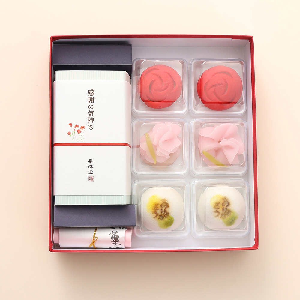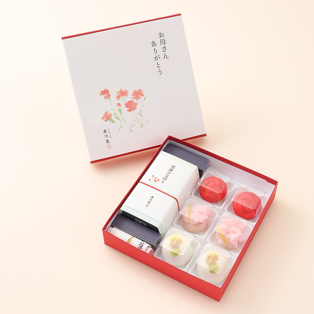 上生菓子(「バラ」・「カーネーション」・「ありがとう上用」)各2個、母の日棹菓子ハーフ 1本