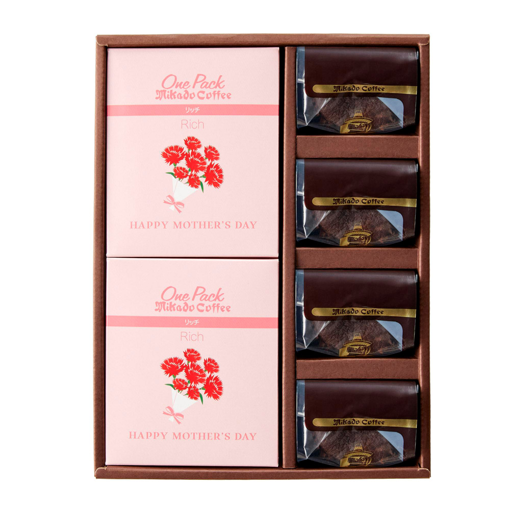 1948年、東京・日本橋創業の老舗コーヒーロースター<ミカド珈琲>がお届けする、しっとり濃厚なチョコレートの焼菓子と、お湯を注ぐだけで手軽にレギュラーコーヒーの味わいをお楽しみいただける母の日専用パッケージのワンパックコーヒーギフトです。