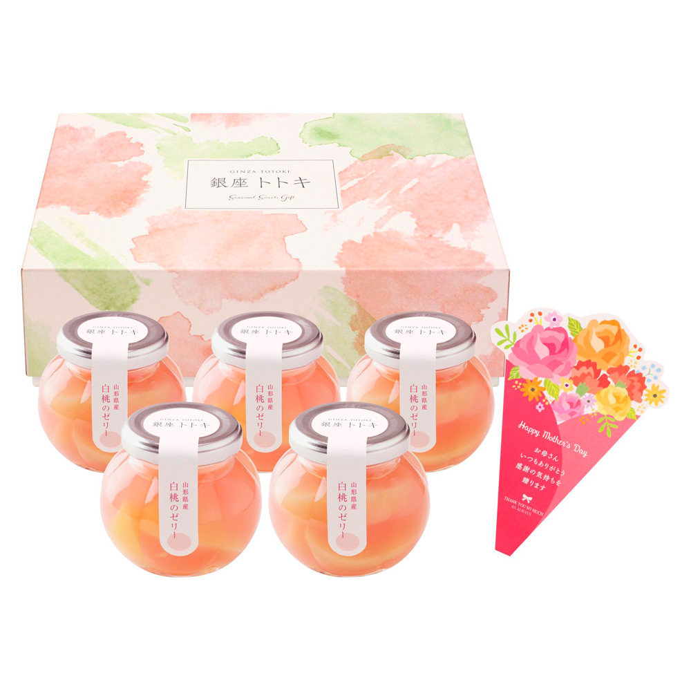 桃の形をイメージした瓶の中に、山形県産白桃の果実と、白桃ピューレで作ったゼリーを閉じ込めました。食べ応えのある果肉と、芳醇な香りが口の中いっぱいに広がります。銀座フレンチの名店が監修するスイーツギフト。母の日のメッセージをつけてお届けいたします。
