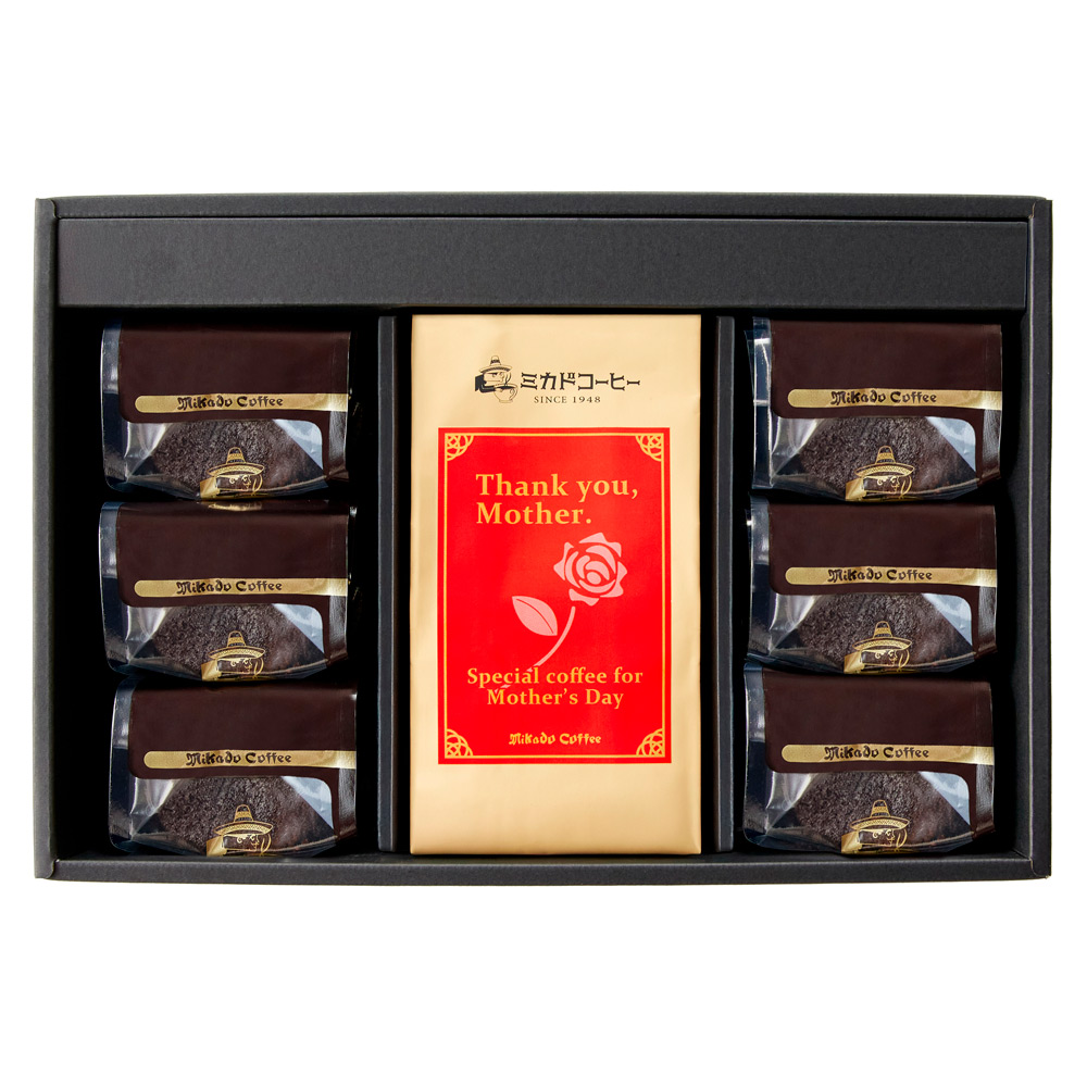 1948年、東京・日本橋創業の老舗コーヒーロースター<ミカド珈琲>がお届けする、しっとり濃厚なチョコレートの焼菓子と、華やかな風味、広がり豊かな甘味とほのかな苦味が特徴のコーヒーのセットです。プレゼント用に母の日カードを添えました。