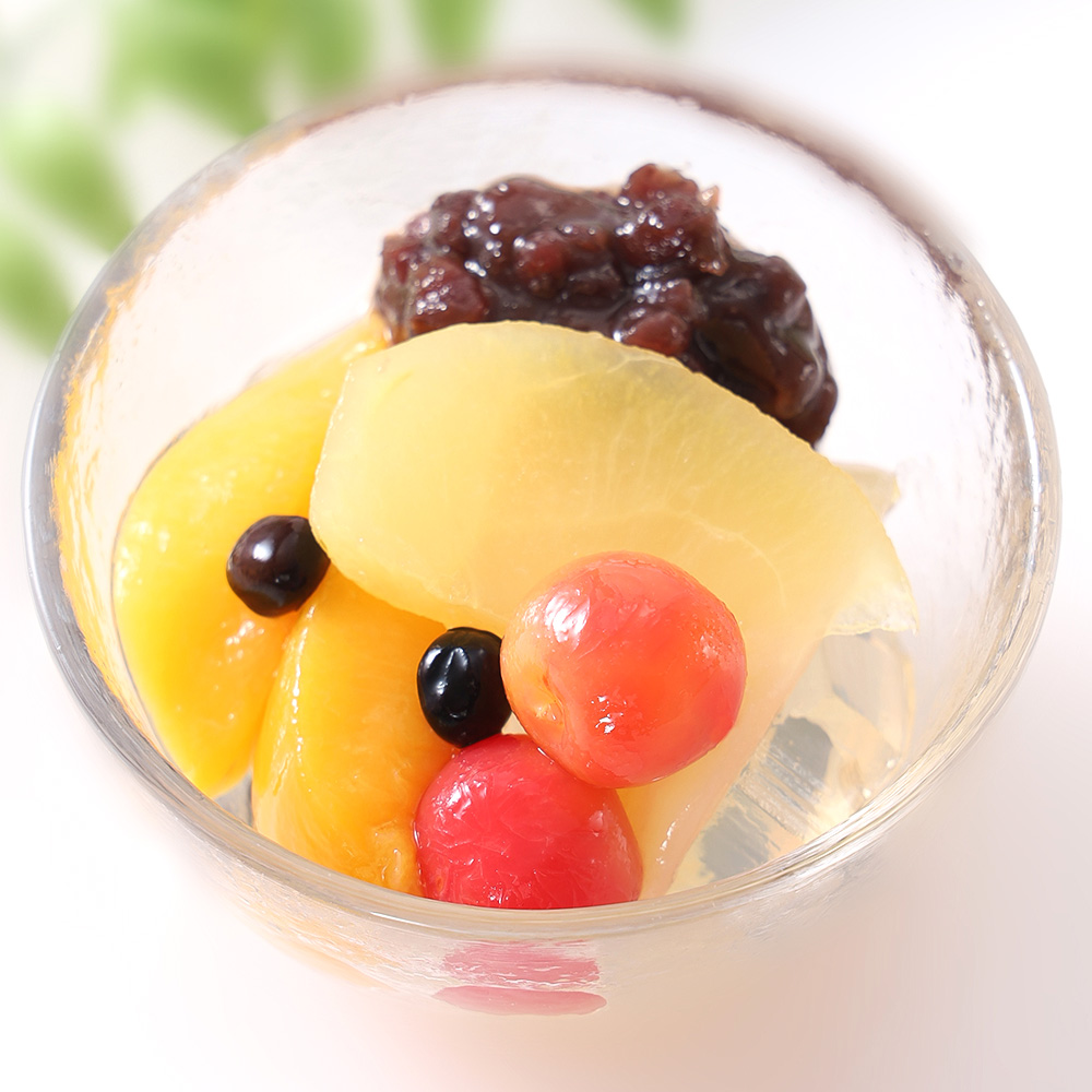 「山形果実フルーツあんみつ」はその土地が生んだ果実の魅力を、最も素直な形で届けるために生まれました。使用している果物は全て山形県産。さくらんぼ、黄桃、白桃、りんごなど、旬の時期に収穫した果実を丁寧に加工し、果実本来の香り・食感・甘みをそのまま閉じ込めています。国産素材にこだわった透明感のある寒天と、やさしい甘さの粒餡が、果実の個性を引き立て、ひと口ごとに山形の風景が広がるような味わいに。美味しいフルーツあんみつと、生花のカーネーション&かすみ草のミニ花束をセットにしてお届けします。