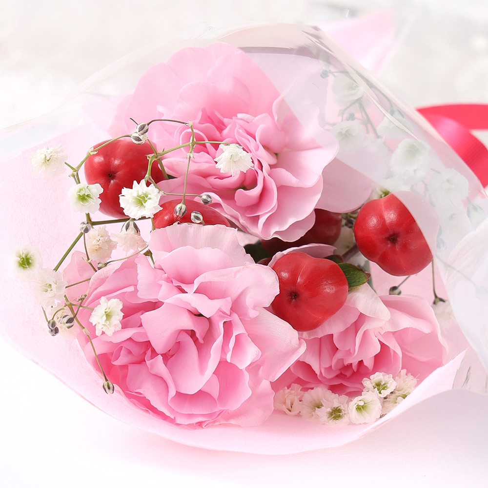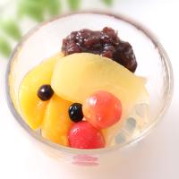 230g(フルーツみつ豆200g(固形量100g)・餡30g)×4、ミニ花束(カーネーション・かすみ草・ヒペリカム)