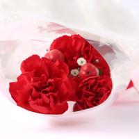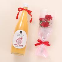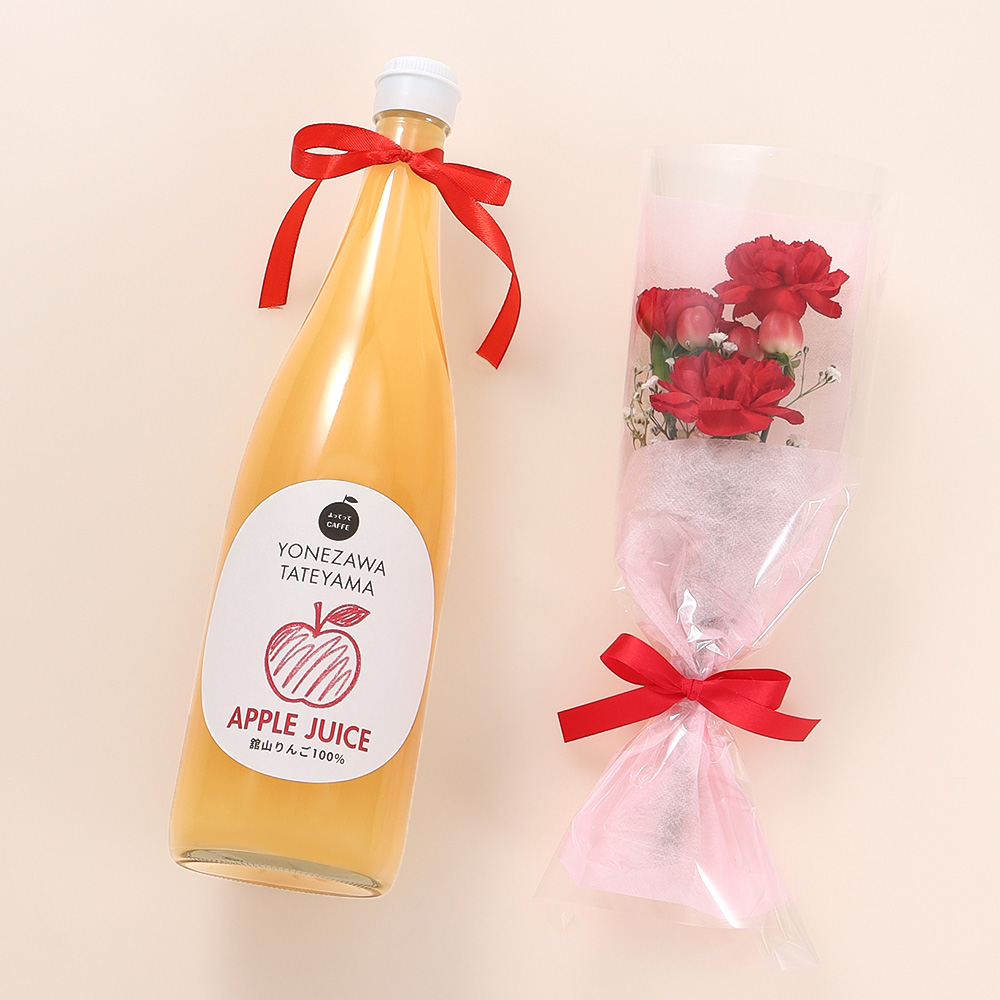 サンふじ林檎ジュース720ml、ミニ花束(カーネーション・かすみ草・ヒペリカム)
