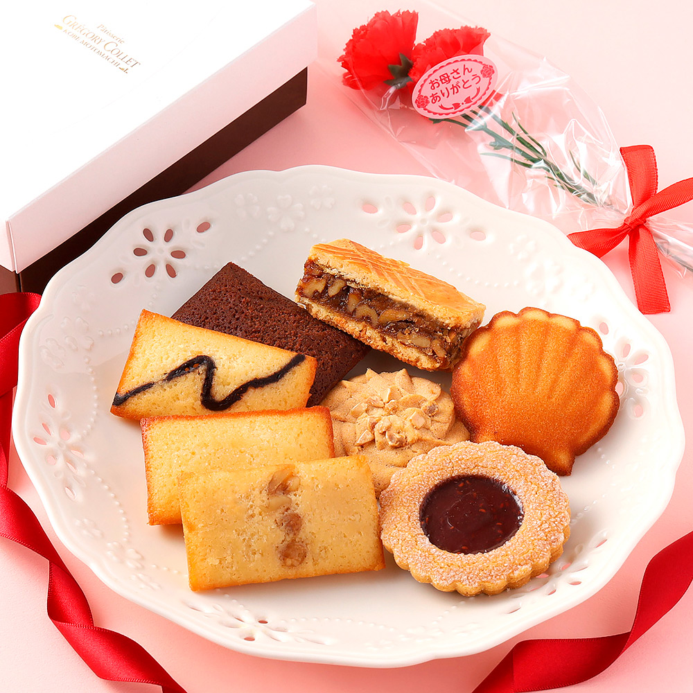 人気の焼き菓子とサブレを詰め合わせたギフトボックスに、母の日の感謝を込めてカーネーション(造花)を添えました。母の日のプレゼントに最適です。