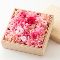 枯れない花「プリザーブドフラワー」を桐箱にたっぷり詰めました。開けた瞬間の嬉しい驚きもプレゼントに。
