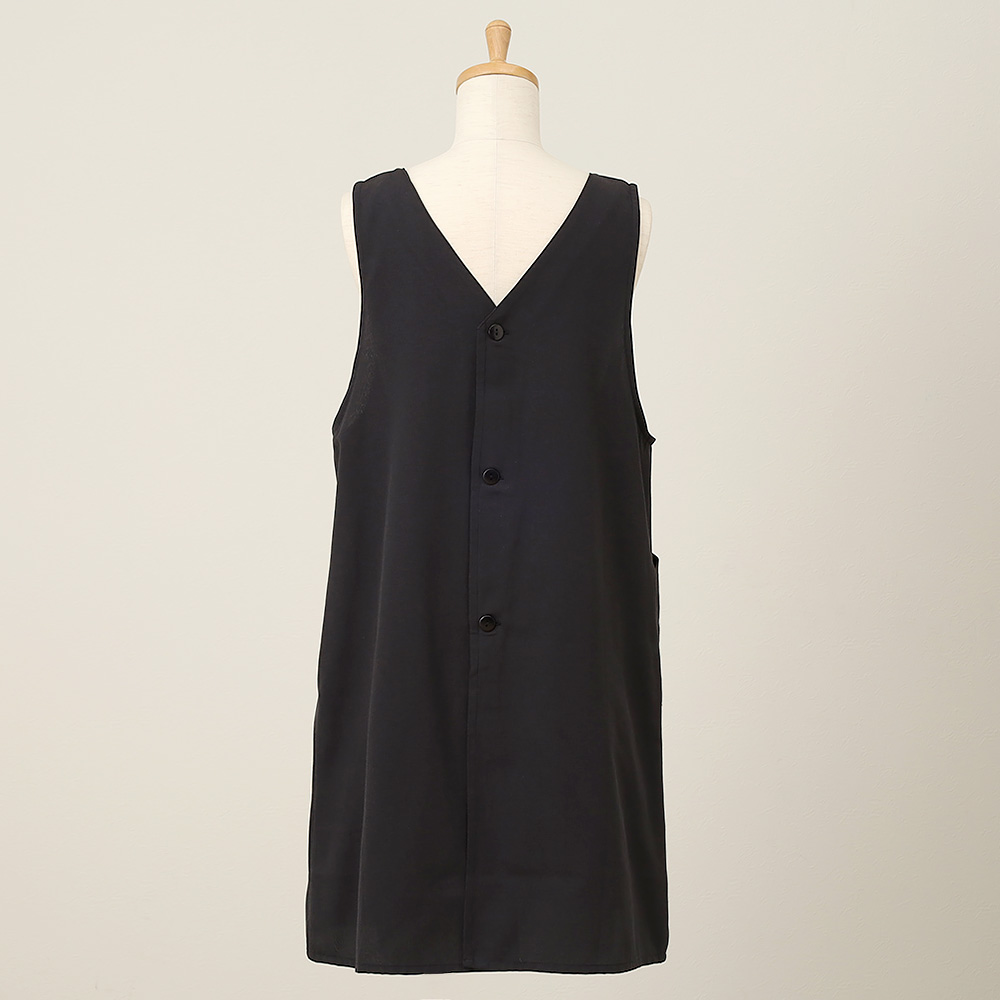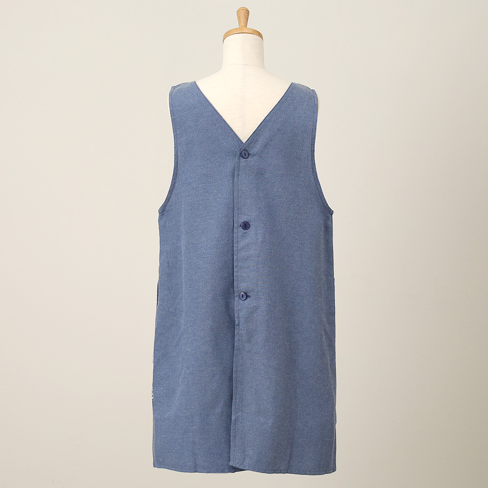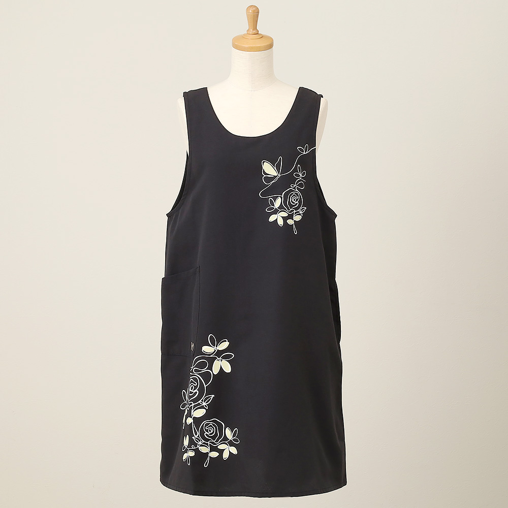 ハーフラバープリントで花々をモチーフにした背中ボタンタイプのエプロンです。着脱がしやすく、背中がすっきりと見えるデザインも魅力です。