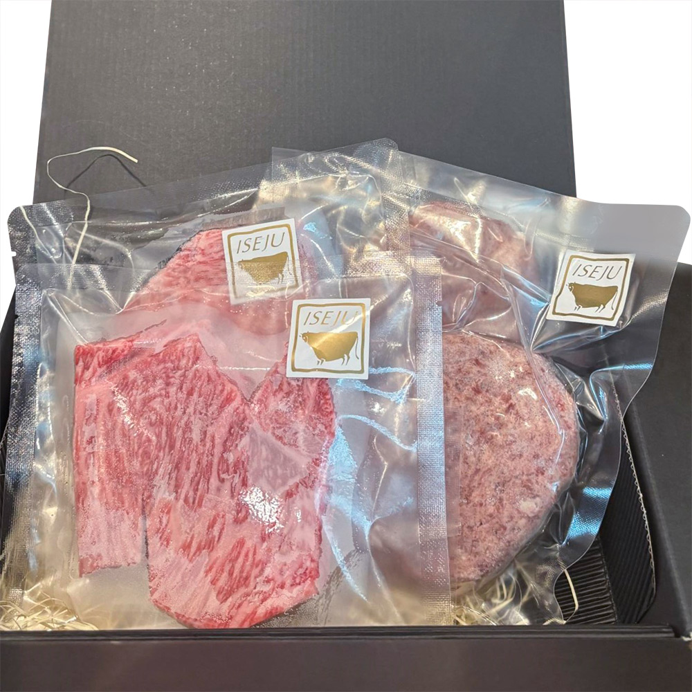 伊勢重の和牛は全てがA5ランクの黒毛和牛。そして産地にかかわらず、その時の良い牛を仕入れています。職人が目利きして選んだ長期肥育の雌牛。そのサーロインを使用したステーキとあえてシンプルな味付けにした和牛本来の美味しさを味わっていただける和牛100%ハンバーグの豪華詰め合わせです。お母さまとご一緒にお楽しみください。
