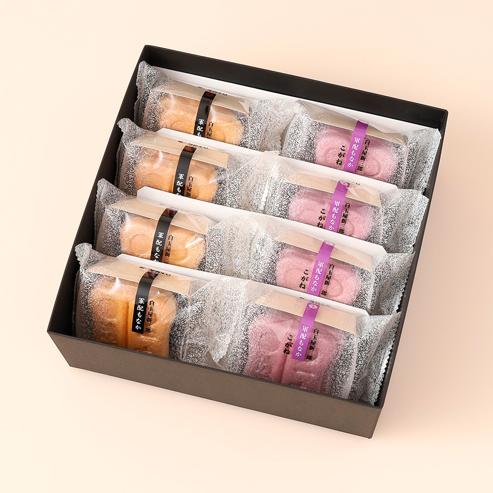 香ばしくパリッとした食感のもなか種と、上品な甘さの「つぶあん」と、「こがね(芋あん)」の2種が楽しめるもなか。江戸時代創業の熊本の老舗和菓子店 白玉屋新三郎が自信を持っておすすめする一品です。