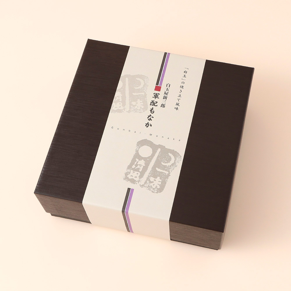 縁起の良い軍配の型で作られたもなか種は、国産もち米に白玉粉を加えて焼き上げており、香ばしさと、パリッとした食感を楽しめます。皮のサクサクとした軽い口どけにもこだわり、何度も何度も試作を重ね、完成いたしました。別添えで個包装になっている、北海道産小豆をふんだんに使用した上品な甘さのつぶあんと、紫芋を使用したうす紫色のもなか種には、もなか種に合うとろりとした芋あんを、袋から出してもなか種に挟んでお召し上がりください。日本茶に非常によく合い、使い勝手が良く味も良いので、贈られた方にも大変喜ばれる一品です。