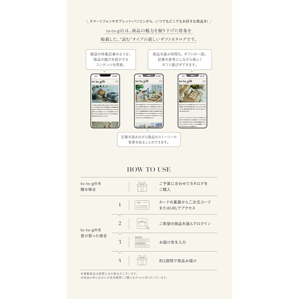 ただ健康であるだけではなく、心も身体も「よりよく生きる」こと。それがWELLNESSです。このギフトでは、自分らしさを大切にするためのリセット・ケア・睡眠にフォーカスしながら、流れていく日々の中に「ととのえる」時間をくれるアイテムをご紹介しています。小さなことでも、それがあると気持ちが軽くなる。ひと息つける。そんなアイテムと出会えますように。カードタイプのギフトカタログは軽量コンパクトで持ち運びやすいデザイン。遠方からの大切なゲストに、引出物や内祝いの品として直接手渡しする時にもスマートです。掲載商品の注文は専用Webサイトにアクセス。24時間どこからでも商品が閲覧でき、ハガキを投函する必要もなくご注文いただけます。