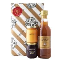 果実を思わせる爽やかな柑橘の香りと上品でコクのある甘みの「スペイン産オレンジの蜂蜜」、いちご、ブルーベリー、ラズベリーをたっぷりの蜂蜜だけで甘み付けした特製コンフィチュール「3種のベリー」、蜂蜜のやさしい甘みに、エルダーフラワーのフルーティーな香りとレモンのさっぱりとした酸味がとけこんだ爽やかな味わいのはちみつドリンク「エルダーフラワー」のバラエティ豊かなセット。