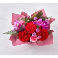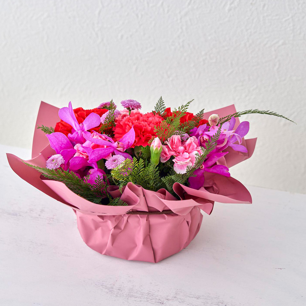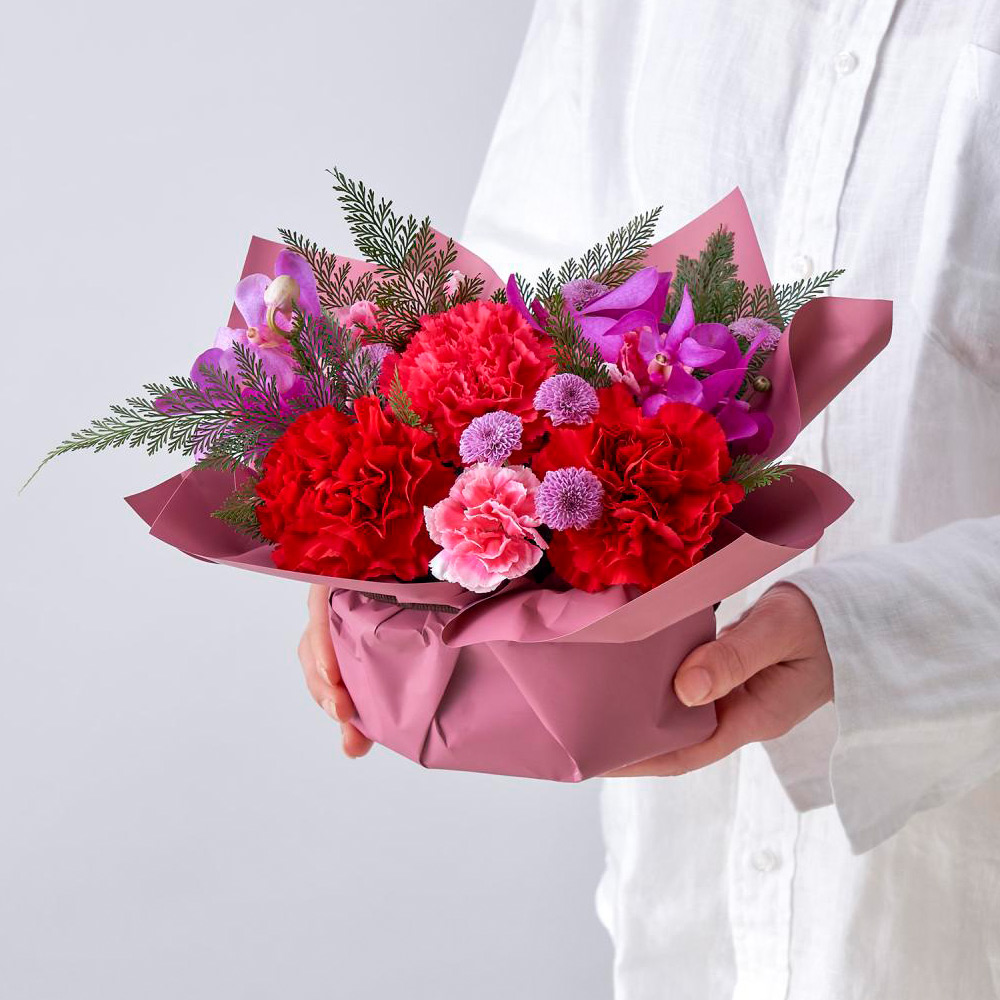 パッと目を引く、情熱的なレッドとピンクの旋律。<日比谷花壇>のデザイナー、西澤真実子氏が提案するのは、伝統的な和の素材をモダンに解釈した、気品あふれるスタイルです。優美なモカラが添えられた透明感のあるデザインは、お母さまの凛とした美しさに重なります。「いつもありがとう」の言葉を、長年の研鑽が生み出す洗練された彩りに託して。心ほどける、上質な母の日のひとときをお届けします。