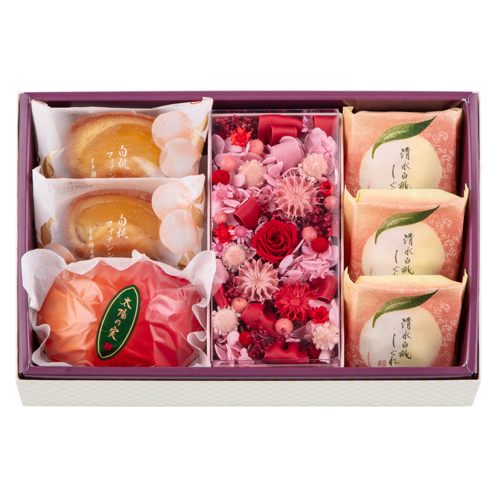 清水白桃しぐれ×3、白桃フィナンシェ×2、太陽の実×1、プリザーブドフラワー×1