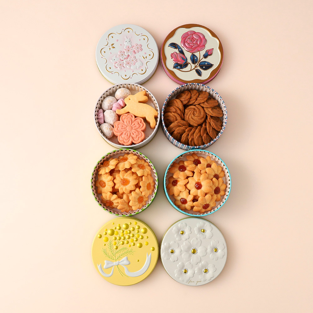 桜とうさぎ缶(65g)、ミモザクッキー缶(56g)、ル・レクチェジャムクッキー缶(55g)、ローズクッキー缶(60g)