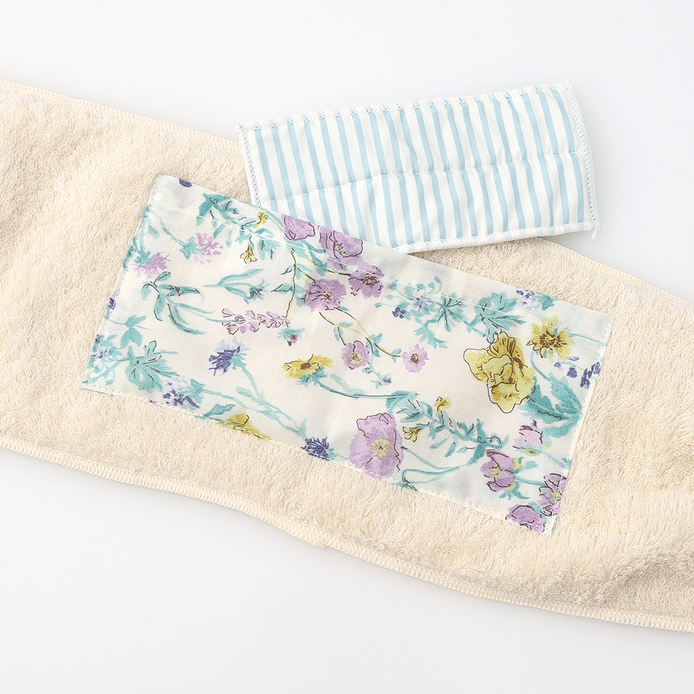 今治産タオル生地を使い、縫製も今治のタオルマフラー。表面とポケット部分が布帛で、裏面がタオル生地だから吸水性があり、汗を吸います。ふんわりと肌ざわりがよく、洗濯を繰り返しても硬くなりにくいのが魅力です。水の気化熱でひんやり感じる、付属の冷んやりシートを内側のポケットに入れれば、日よけしながら心地よい涼しさに。首をしっかりおおえるから日よけ対策にもお役立ち。片方の端がループになっていて、もう一方の端をここに通すだけできれいに形が決まります。首に巻いたまま顔の汗も拭け、ガーデニングや散歩、スポーツ時にもお使いいただけます。